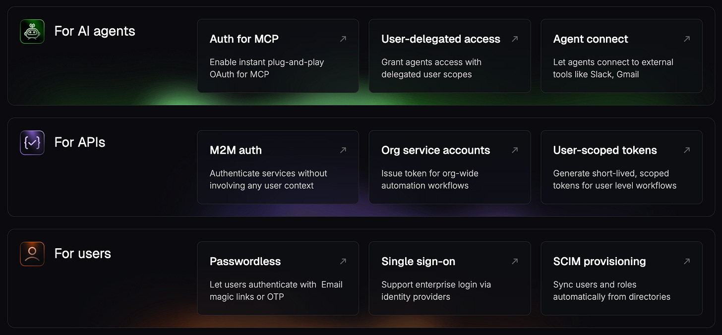 As AI applications become the norm, developers face new authentication challenges that traditional auth providers weren't built to handle. Incoming agents need secure access to your MCP servers and applications. Outgoing agents need to act on behalf of users in Gmail, Slack, and Notion. And AI applications still need to authenticate human users and secure APIs. Instead of building custom OAuth implementations and piecing together different auth solutions, AI teams need unified infrastructure.